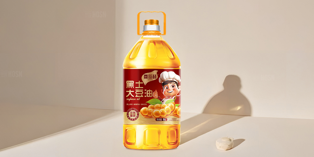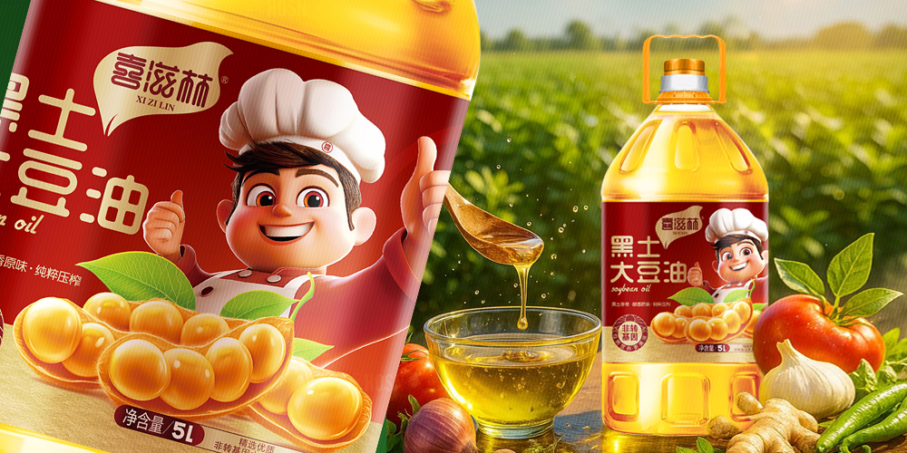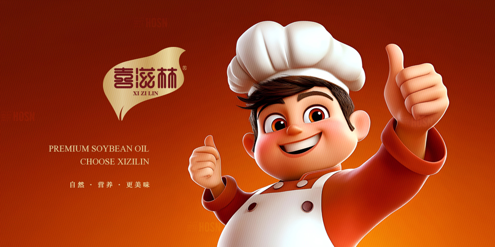 喜滋林以「年轻主厨的活力赞许」为核心理念,将烹饪的热情与油脂的醇香巧妙融合。品牌IP——一位笑容明朗、双手点赞的青年厨师,不仅是视觉符号,更是品质承诺的化身:他仿佛亲自认可每一滴油的纯正,以动态手势打破传统油类包装的沉闷,传递「专业推荐,安心之选」的情感共鸣。包装设计以炽热红色为主调,既呼应中餐烹饪文化中对火候与香气的重视,又彰显年轻化的自信张力。合声广告采用强化视觉冲击力,搭配IP形象与产品名称的错层布局,营造出灵动现代的货架表现力。整体设计用IP形象拉近与用户的距离,让大豆油从厨房配角升级为创意餐桌的共创者,传递「喜于味,滋于饪,甄选好油」的品牌概念。
