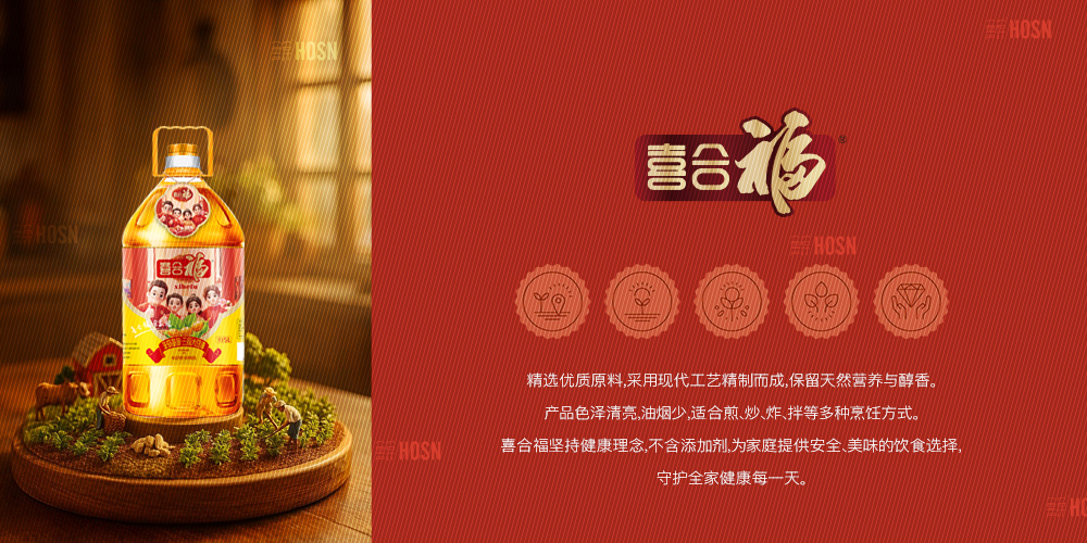 深度挖掘粮油消费的 “家庭属性”,合声为喜合福提炼 “福满家,油选喜合福” 的品牌主张,将传统福文化与现代家庭的品质生活需求绑定,让品牌从 “卖粮油” 进化为 “传递家庭幸福感的载体”。