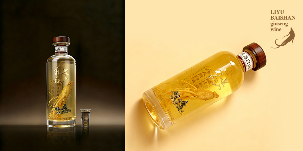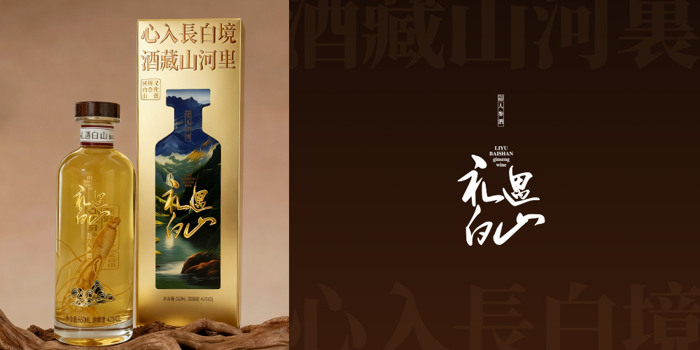 我们以 “心入长白境,酒藏山河里” 为核心主张,锚定长白山 “人参圣地” 的地域 IP:实拍通透瓶身直接露出完整人参,让 “真材实料” 成为最直观的品质语言;瓶身书法字体与山水元素呼应长白山意境,搭配包装的金色质感 + 长白山插画,既用高端视觉传递养生酒的价值感,也把 “山河藏酒” 的文化情怀融入每一处设计细节。